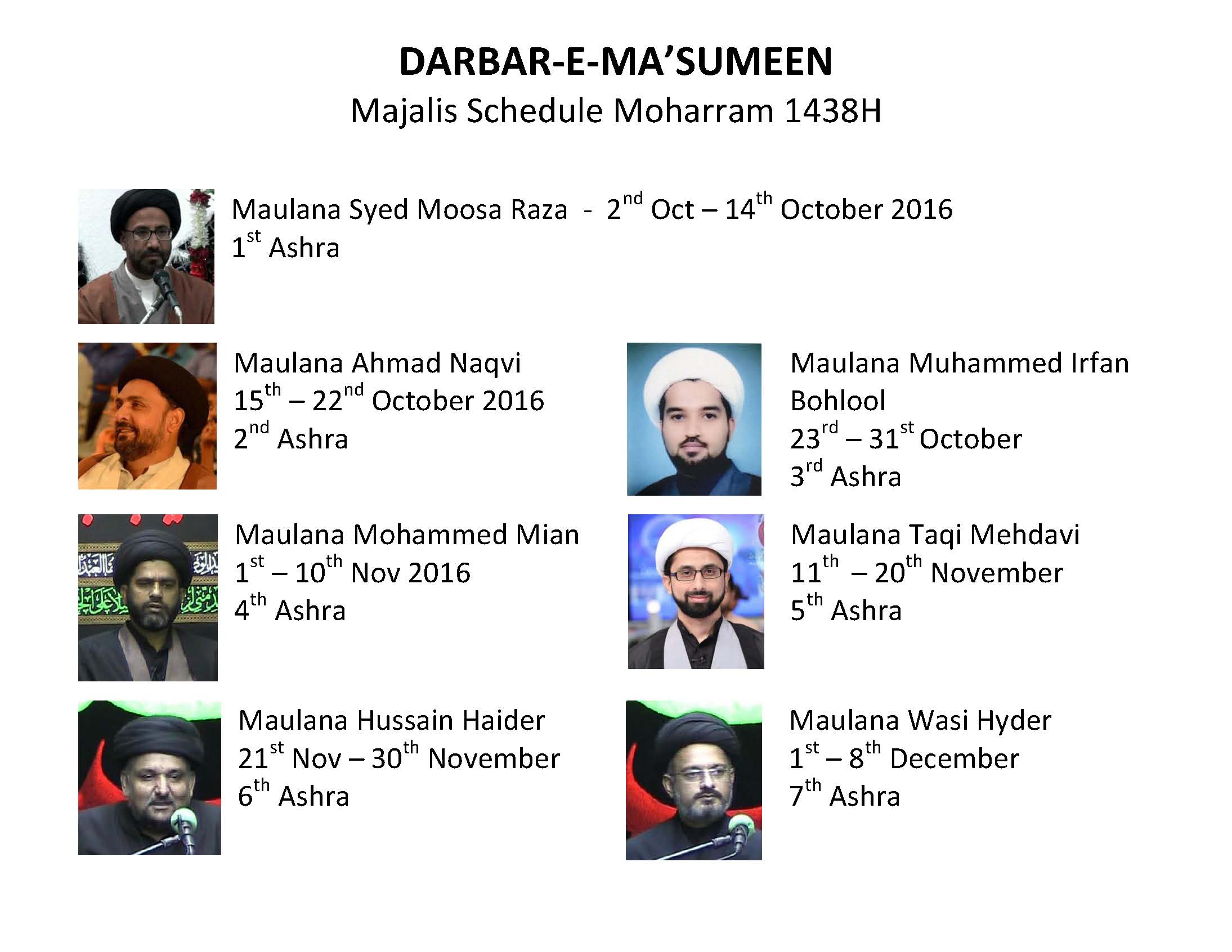 | Maulana Syed Moosa Raza | 1 -11Muharram | 2-Oct-2016 till 14-Oct -2016 |